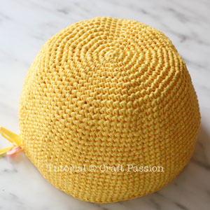 Şapkanın arkası böyle görünüyor. İlmeğiniz yeterince büyükse ilmeğin içinden iplik çekmeye devam edebilirsiniz, aksi takdirde oltayı kroşe dikişlerle birlikte taşımanız yeterlidir.