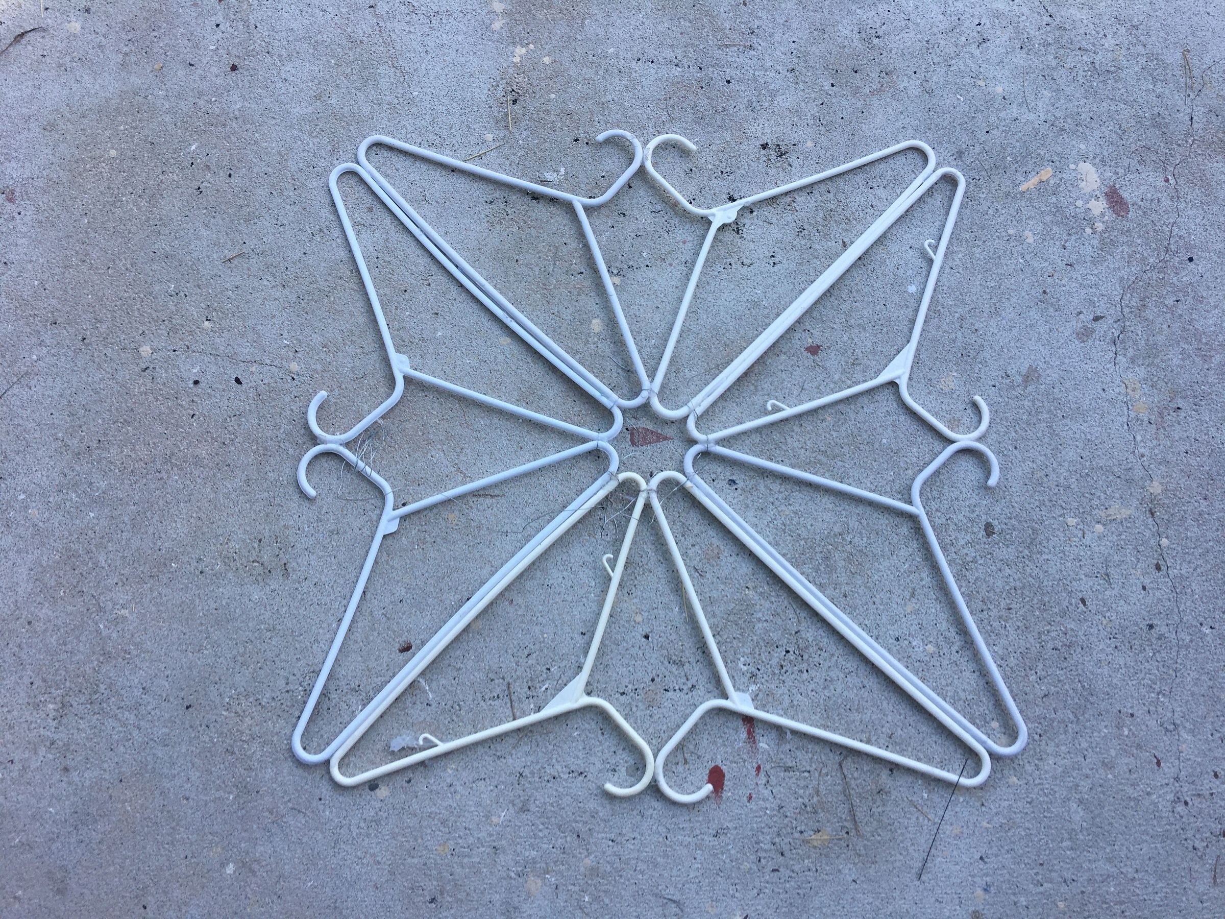 Tel 4 setleri gösterildiği gibi birlikte. Kar tanesi simetrik olana kadar ayarlayın, sonra birbirine yapıştırın. Diğer askılar için tekrarlayın. Kabloyu çıkarın.