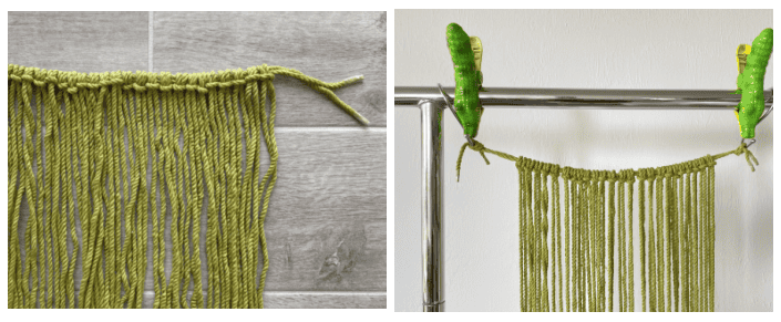 Lark'ın Kafa Düğümleri – düz bir yüzeye yatay olarak iki adet 20" kablolama yerleştirin. Bunlar sap olacak. Daha sonra, Lark'ın Kafa Düğümlerini kullanarak, iki yatay parçaya 24 parça kablolama (her biri 92" uzunluğunda) bağlayın. (Aşağıdaki fotoğraftan projeyi S kancalı bir rafa taktığımı görebilirsiniz; ve evet, bunlar kancaları yerinde tutan plaj havlusu timsah klipleri! Hey, elimdekileri kullanıyorum!)
