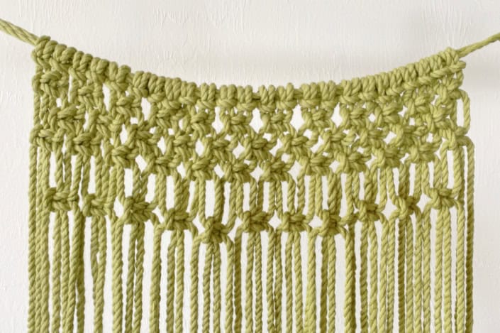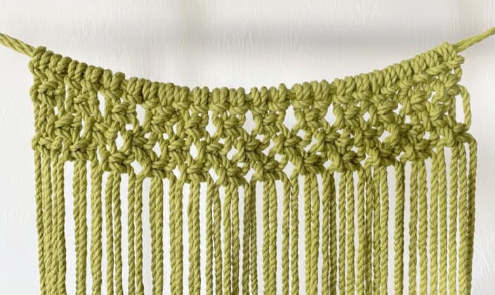 Satır 4 – Dördüncü satırı son satırdan yaklaşık 1" aşağıdan başlatın. Soldaki üçüncü kabloyla başlayın ve 11 Alternatif Kare Düğüm sırası yapın.